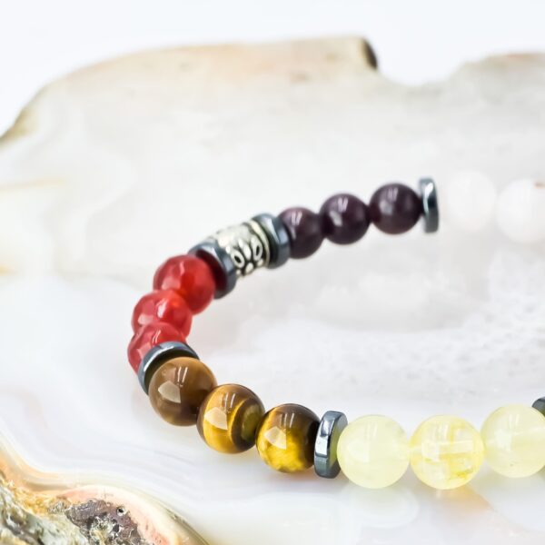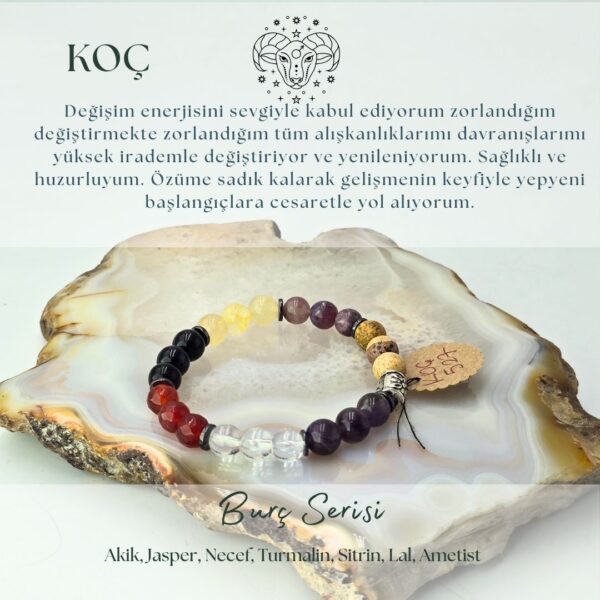 İkizler burcunun hareketli, meraklı ve iletişime açık doğasına özel olarak tasarlanmış bu bileklik, Garnet (Lal), Sitrin, Kristal Kuvars, Akik, Kaplangözü ve Turmalin taşlarının birleşimiyle zihinsel berraklık, canlılık ve enerji sağlar. Değişken ruh halini dengeleyerek motivasyonu artırır ve İkizler’in doğal zekâsını güçlendirir.